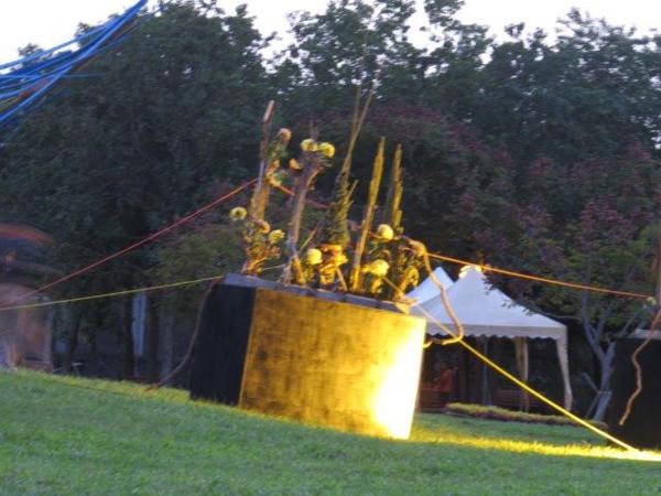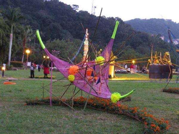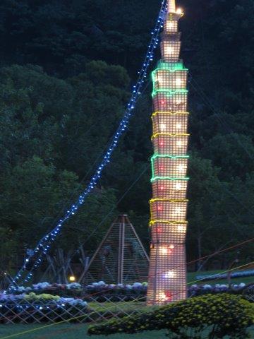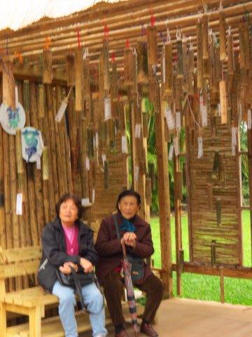 無法再至其它展覽室觀看,於是走至草坪區有各種不同竹編造型,呈現竹與影交錯,高、寬與深三度空間設計,還有竹木建成大型山體矗立於青草地上,幻化為臺灣島山脈,此展區為舞秋菊和Formasa山水。