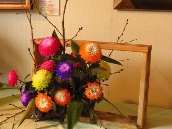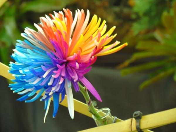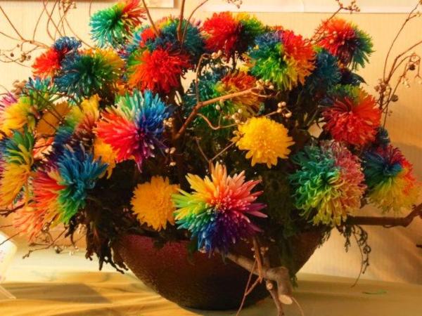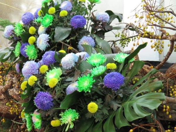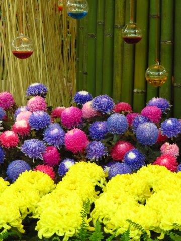 走至花竹筵開喜溢滿堂展覽室看到了各種色彩的菊花-藍、紫、紅、黃、綠,七彩菊更是另人眼睛一亮,想要慢慢觀賞這多彩花藝時,服務人員告知五點展覽室就得關門了。