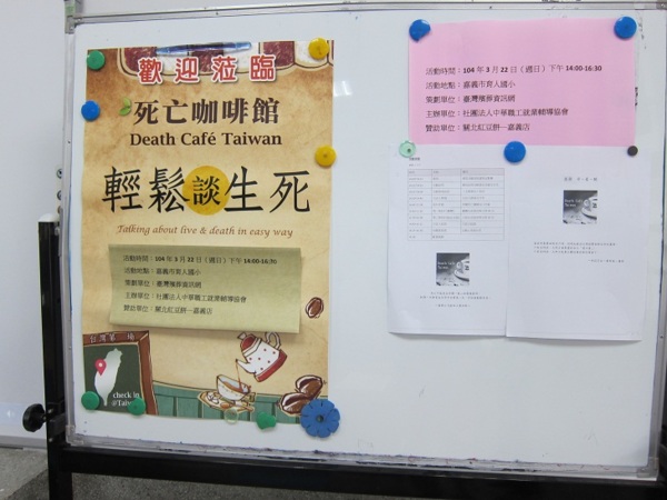 臺灣第十二場「死亡咖啡館」活動已於104年3月22日(日)下午2點到4點30分,在嘉義市育人國小圓滿結束。這一場負責主辦的是社團法人中華職工就業輔導協會,點心飲料由嘉義關北紅豆餅嘉義店贊助提供。