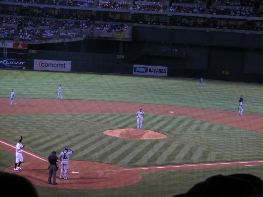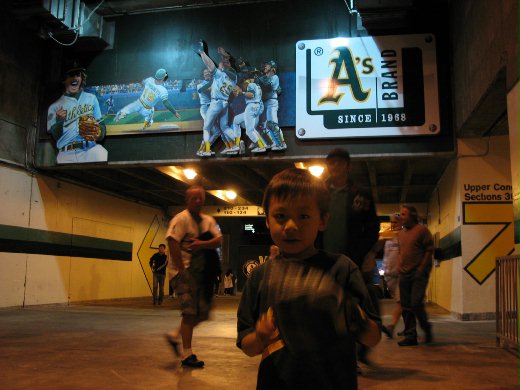 說到看球,在1997年,我結束了在南加州過的“清苦“(卻充實)的生涯,搬到矽谷上班後,我終於有“閒錢“(空虛的工作換來的)可以看球了。剛好我的同學來美國受訓,突然發現:從矽谷開車到奧克蘭看球,一方面可以好好跟同學聊天,一方面花的錢不多(當年一張不錯的球票好像才十塊左右),然而,最重要的是:在盯著螢幕工作一整天之後,看著燈光照耀下,球場上綠油油的草皮,真的讓人整個放鬆下來。