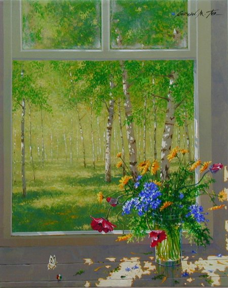 Gorban is a Russian Born Iseraeli artist. His previous session of works were focus on windows. This art piece is very impressive. Gorban's arts usually have some good meanings. The depth of the forest, especially green, is something that he doesn't get to see in Russian, same as the butterfly, with the freedom to decide whether it wants to fly out or stay, in front of the open window. That colorful marble, the only strong color, strongly contrast to the rest of the painting, must mean something else. The color, the shape? I don't know what it means but it is just gives me that refreshing feelings.