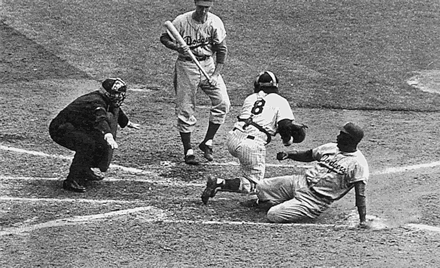 六十年前的今天 4 月15日, 是美國第一位黑人棒球員- 傑基. 羅賓森, 打開種族藩籬的日子.我的書房掛的這張相片是羅賓森在美國職棒總冠軍的世界大賽到本壘的經典,就是希望不斷提醒自己這位偉大人物代表的各項表現與精神.