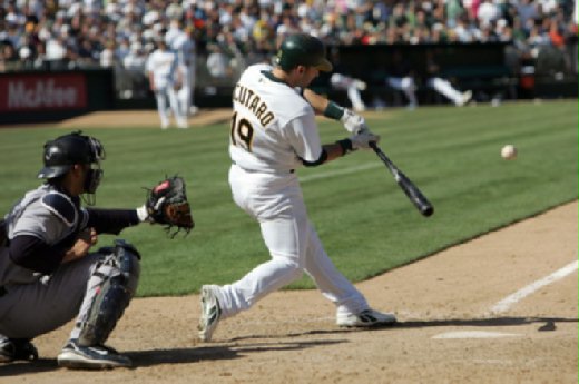 沒想到他竟然在打出一支界外球時打斷了他的棒棍, 換了新球棒,竟然一棒揮出一支打到界外線高塔的三分再見全壘打, 運動家今年終於贏了第一次的連戰(SERIES).