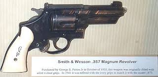 看過”巴頓將軍”電影或在電影中看過巴頓的人,一定對他右邊腰間那支象牙柄六響左輪槍印象深刻。其實大部分人看到的都是作秀的槍,在左腰掛的是另一支巴頓稱之為”殺人槍”(Killing Gun),象牙柄史密斯威森.357麥格農左輪槍。