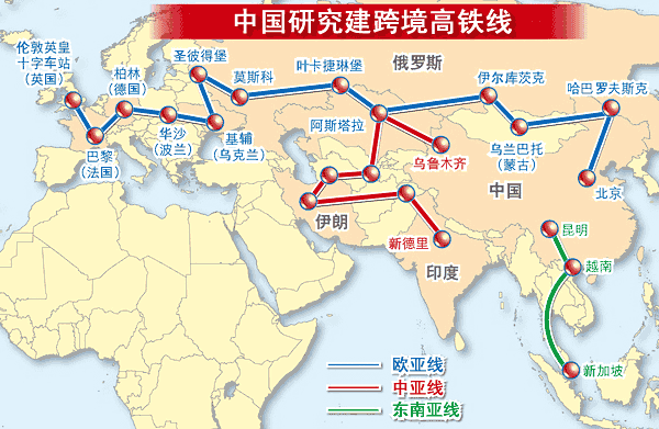 就此政經戰略規畫,中國提出的高鐵大通道,除串連東南亞諸國的泛亞高鐵(中寮泰馬新高鐵)與甫簽約的塞匈高鐵外,還有穿越中亞連結中東歐的「中亞高鐵」,以及從廣東為起點途經中南半島、印度,由伊朗進入歐洲的「第三條歐亞大陸橋」。