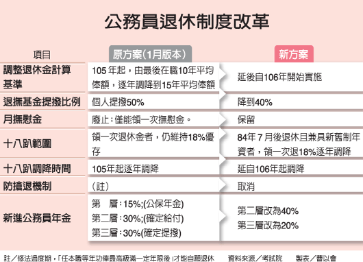 另外,退撫基金現行是公務員自提35%、政府提撥65%,銓敘部原規劃朝向個人、政府各提50%,但公務員強力反對;銓敘部送考試院的草案,提撥比例調整為公務員自提40%、政府提撥60%。