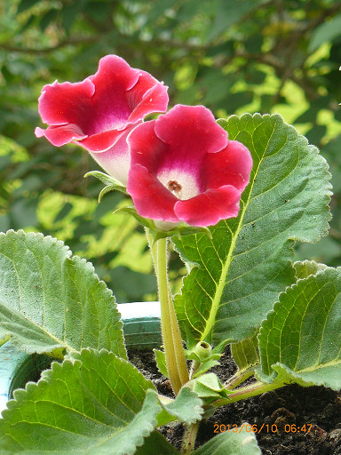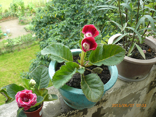 上午, 把昨日NT$39新購紅花大岩桐小盆栽與原有兩盆拍照比較.