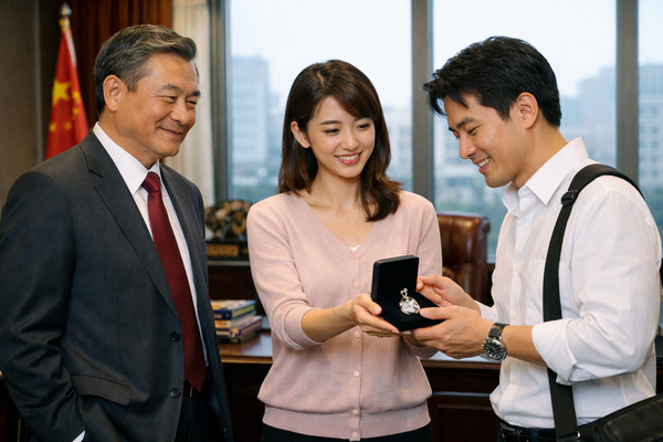 Guo Xinmei: (handing over a small gift box) Brother Yang, this is just a small token of my feelings.