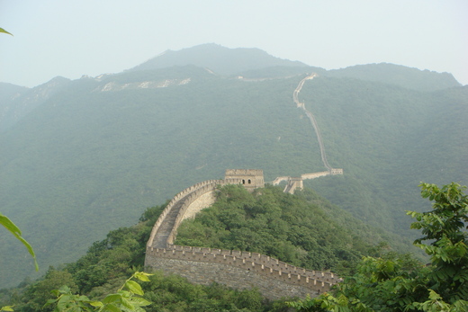 纜車送我們到最高點。爬上最高點,長城分兩邊。左邊一直去,想來就是往西囉;遠遠更高的山上,大大的x x 毛主席。 看不清楚寫些什麼在山頭上,反正毛主席的宣傳效果達到就好了。往右就是我們的行程,終於踏上我人生第一步長城路。沿著山瘠建造的長城,蜿蜒無止境,還有分叉,讓我不得不佩服什麼叫做堅強意志,才能想像所謂孟姜女哭斷長城是如何辛酸血淚。