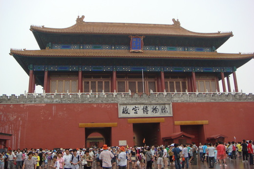 我們從午門購票,進場。天呀!終於見識中國的人多。到處飄揚旅行團的小旗子。外國人沒有想像那麼多,反而都是別處來的中國人。 看到人這麼多,好興奮。 突然一陣大風,讓廣場裡黑壓壓人群中,飛揚起一堆紙屑到空中。真是可愛的天氣,紙屑和人一樣多。 可惜來不及拍那一幕,真是好玩極了。