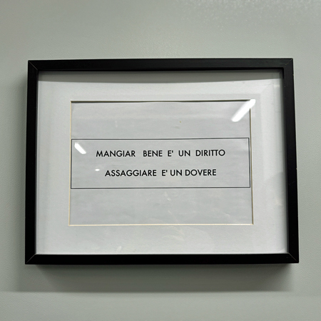 高掛廚房牆上的語句中文大意是 『吃得好是權利,品嚐是義務』,挺適合義大利人的一句話(笑)。據說世界級時尚盛事「米蘭時裝週」年年在此舉辦酒會、幾乎已成傳統;我等雖不是衣香鬢影時尚名人,尋常老百姓在此一樣可以享受吃得好的權利。