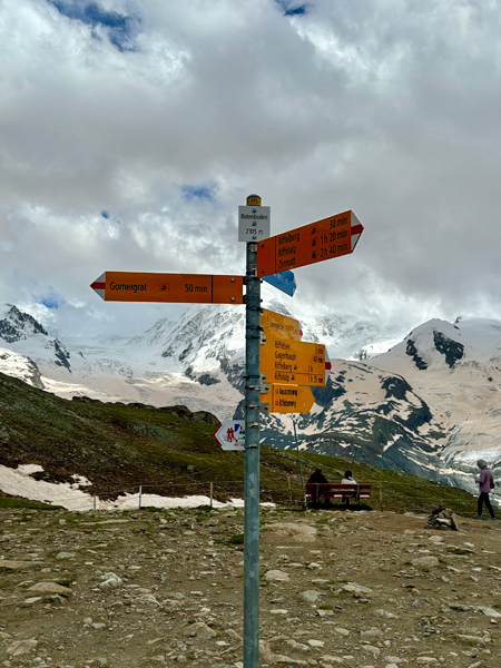 這是健行指路牌,沿步道回到 Zermatt 需兩小時四十分鐘,還是搭車下山吧