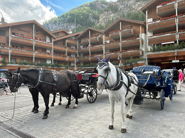 轉眼間便回到小鎮,乘登山列車既可賞山看冰河,下山時又能俯瞰全鎮,是一好行程。站前壯碩大馬、馬車伕正在招徠乘客遊小鎮