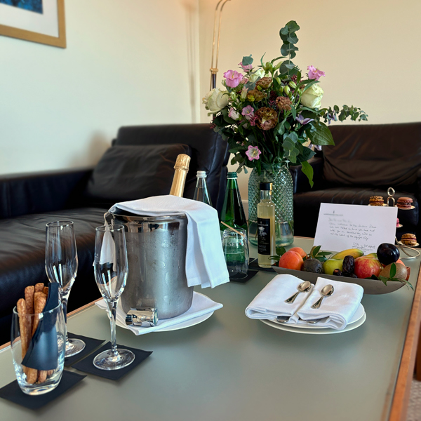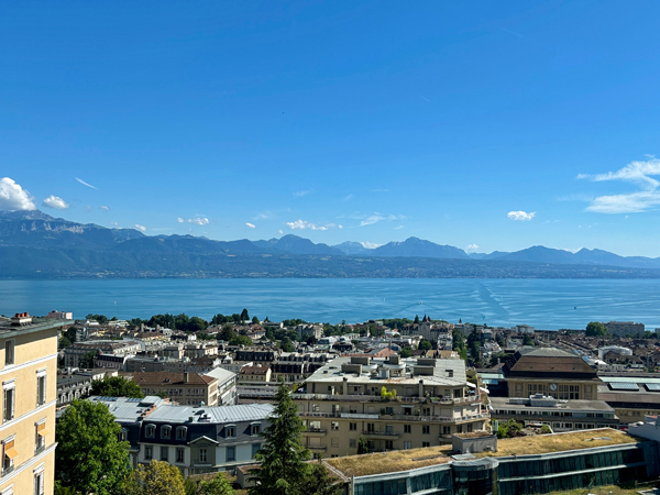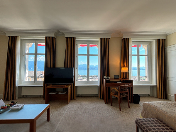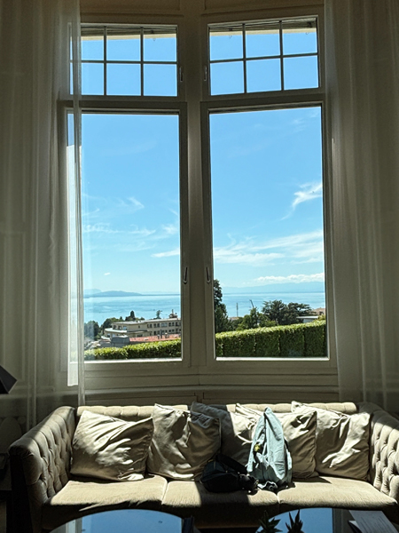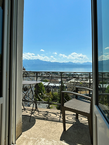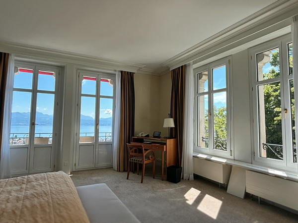 啤酒、生蠔、春卷不知不覺也飽了,房間終於備妥可入住。雙人房簡潔寬敞、並無多餘的 opulent / 華麗裝飾(甚好),窗外便是日內瓦湖(Lac Léman / de Genève)美景