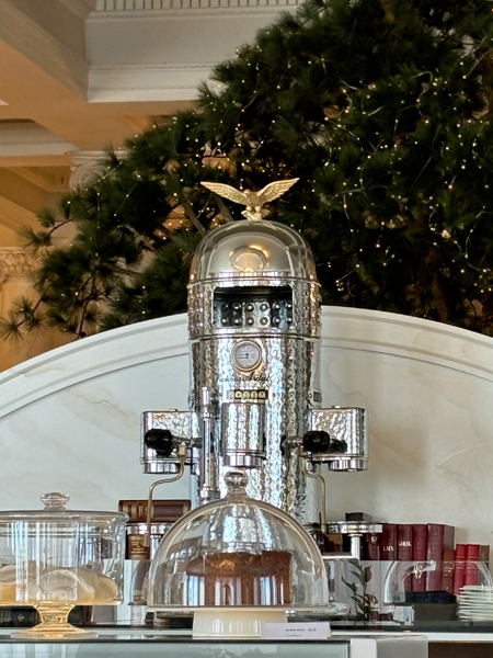 百餘年歷史的飯店建於「美好年代」(Belle Époque)晚期,雖然一開張就逢第一次世界大戰,但裡裡外外仍處處可見屬於那時代的奢華、多元風格,吧台後這一座古式咖啡機就與環境十分契合