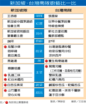 台灣舉行中華美食展,其中最吸引人的應該是世界廚藝邀請賽,據說舉辦了幾屆,地主台灣南、北兩支代表隊還沒闖過資格賽。今年南台灣隊十分爭氣,一路「煮」進冠亞軍爭霸戰,對手則是新加坡隊。看到此新聞,雖覺應憑廚藝分高下,但也希望本地代表隊終能得勝。