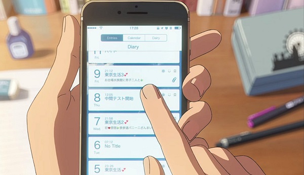 跳躍式的改變觀者視角還有主角間的變化流動,「互換身體」或「互換靈魂」這種題材也不是新鮮題材,不過《你的名字》既有辦法不讓手法流於窠臼又能保有劇情本身張力,這點,在角色生活日常的細節就處理得很好。小小放個地雷,像是主角們使用手機寫日記,紀錄下發生的事情。