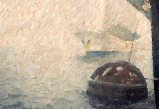 △ 逆浪前進的船隻,壓在船頭的大浪,船頭整個沉下,船隻不進反退。