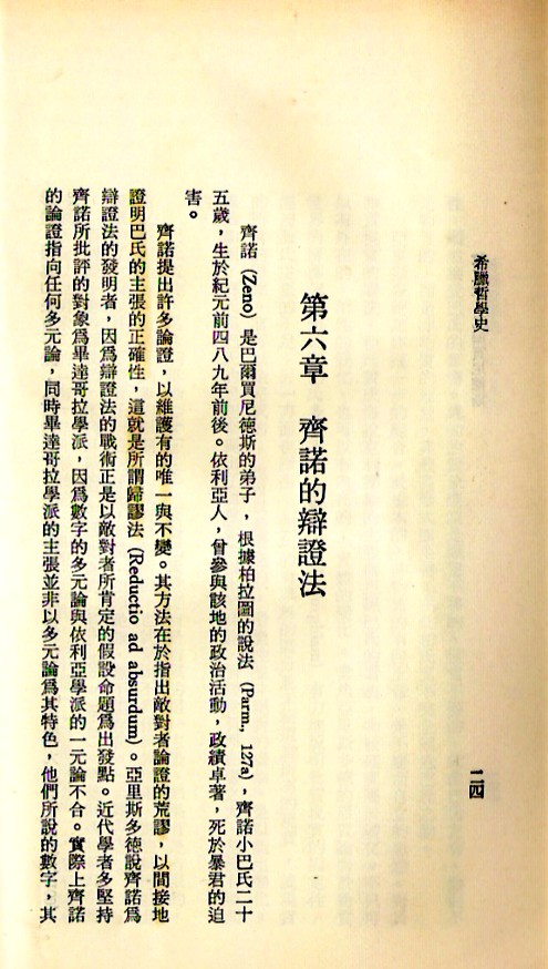 齊諾的辯證,似是而非,不但對於維護巴爾買尼德斯(註三)之說無益,而且開後世詭辯之風,如果說詭辯也有助於真正哲學的建立,其作用最多也只是消極性而已。
