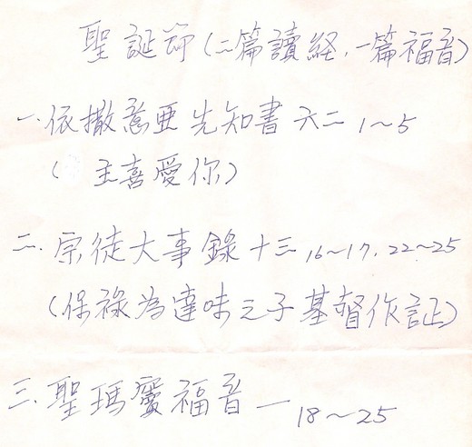 上圖的手跡記得是一位義大利籍的修女的。大約十五年前吧(三十歲初),參加第一次聖誕夜的彌撒後,關於這一段讀經與那段福音間仍有衝突吧,當時又沒有帶筆的習慣,那個周日再請教修女下,修女寫下給我的。