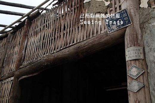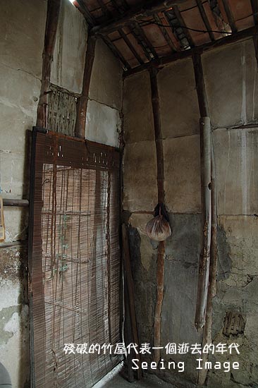 泥灰已經剝落了一大塊的牆面,露出裡面原先被包覆的竹網,陽光從外面透射進來,讓屋內的塵灰悉數可見。竹屋內有兩個空間,一個是掛有竹簾的客廳,另一個是堆滿了雜物的房間,我猜這裡從前應該是阿婆的臥房,有一個曾陪伴她渡過無數個孤獨夜晚的小竹窗,必定承載了阿婆無數的祕密。走出竹屋,這才發現屋頂的瓦片也已掀開了一大塊,底下的竹椽似乎快擋不住屋瓦的重量,一副快要重壓下來的樣子。