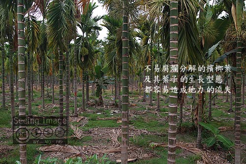 但是,檳榔的樹根淺短,抓地力不足,以及檳榔葉的生長型態(葉子易造成聚水性)和不易分解腐爛的特性,都容易造成土壤流失;再另一方面,因為整地、除草、灑農藥,造成地披植物不足,裸土直接日照使土壤乾硬,雨水滲透力差,快速蒸發下,導致地下水位下降,接著就是地層下陷,所帶來的危機實在不容小覷。因此,即使在平地種檳榔,也應該要做好水土保持的工作。