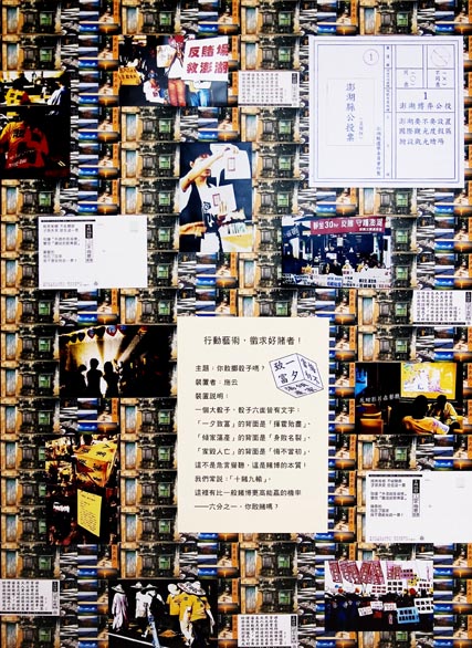 這次的展覽在澎湖的入口──馬公機場,展覽場地不大,每個人只有1-2件作品,我正好將這次在澎湖博奕公投期間所拍的照片、資料、文件等做一個整合,以「黑格爾『正、反、合』在澎湖」作為主題,做了一張拼貼作品,現場還擺放了未發完的卡片供參觀者索取,以及一顆原本要作為行動藝術演出而未用到的大骰子,和一本「反賭日記」,另有一部紀錄片因準備未及,延後放映,地點另選在朋友的店面櫥窗。