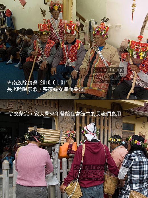 關於「除喪祭」,我曾在「台灣大百科」中有以下記述:「『除喪』是卑南族特有的一項祭儀,它代表了部落成員共同為喪家袪除哀傷,以迎接新的生活。年祭期間便會有一連串的除喪活動。首先,在猴祭祭典中,由父母皆健在的少年到部落中當年家中有喪事的人家破門除喪,他們由後門破門進至客廳內跑一圈,同時喊出「pua」一聲,再由前門跑出,表示將舊一年不好的事物及惡靈趕走。大獵祭最後一天,在迎接獵人歸來的凱旋營地喪家必須坐在另外以竹子專門搭設的小型喪家休息區,等待族中長老將喪家頭上戴著的綠色花環拿掉除喪。族人並在歌舞中邀請喪家共舞。最慎重的是在元旦早上,部落長老們穿著傳統服飾,率領眾人來到喪家唱歌安慰喪家,場面極為感傷;祭後,喪家則要備食物及檳榔招待回禮。從這一天開始,喪家才可以盛裝、戴花及參加歌舞活動,重新加入部落正常的生活。」
