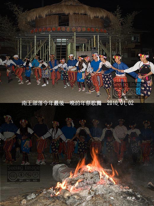 元月第二天晚上,是南王部落年祭的尾聲,部落的男女老少,只要著傳統服裝都可以加入舞圈,盡情享受今年年祭的最後一刻狂歡。我沒有卑南族的傳統服裝,自是只有看的份,後來跟了南家人去他們隔壁親戚家吃飯,所以也沒跟著撐到最後一分鐘,但是當主持人之一的南兄弟(就是我前幾天在報佳音時相認的那位)回到宴席上時,對大家報告:「越晚來的人越多,大家都跳得很賣力、很盡興,後來連老人家都深受我們感動,不僅下來一起跳,而且還唱起了古調,整個氣氛好極了!」他說的時候,難掩興奮的心情。