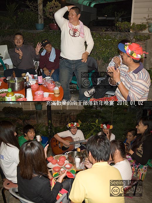 雖然沒有見著他所說的「年祭歌舞好氣氛」,但是我們這裡的新年晚宴也是氣氛極佳,大家一直玩到11點才各自回巢。原來以為只是去吃個便飯,沒想到一桌豐富的佳餚,以及到場的大大小小親戚、鄰居,一共席開兩桌,就在他親戚家(請原諒我忘了他們姓什麼了,下次一定要給我名片,不然我很不會記名字地~)的院子裡。兩桌是分成「大人桌」和「小孩桌」,大人這桌有個很會表演、說笑話的「姊夫」,他充滿豐富趣味的肢體語言,把整場的人逗得樂不可支,我以為他是哪個表演團體的人才,結果竟是沒被發掘的隱才,真的是可惜了!他和另外兩名姊夫(當然是三姊妹的「各自」夫婿)不知哪一次聚會,也是像這次這樣,三人並肩坐在一起,結果被戲稱為三隻土撥鼠,最後這三隻土撥鼠便認命地一起跳了「土撥鼠舞」來娛樂大家;小孩子的這一桌也不遑多讓,早我們開始就先彈起了吉他,唱起歌來了。儘管中途飄了點小雨,大家還是笑到沒空搬桌,顯然小雨澆不息我們的熱情與歡樂。