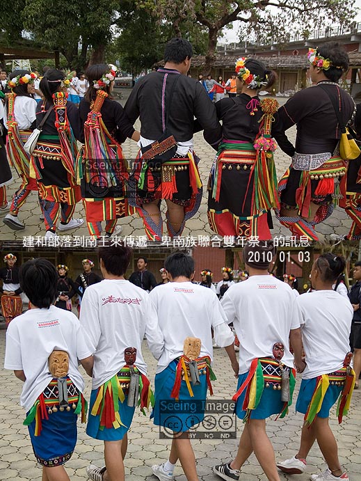 建和「報佳音」隊伍首先由五位腰繫長筒鈴的少年舞進會場,他們的長筒鈴上方還有一面互異的小面具,特別引人注意。接著,他們引出其他盛裝的少年、少女,整齊的舞步、鮮豔的服飾、稚嫩的臉龐,真是一幅美麗的畫面!南王這邊也有幾位青年、少年代表迎接,但是比較起來,人數、裝扮、氣勢,實在遜色很多。兩邊舞隊共同跳了幾圈之後,由兩位建和少年持著長長的竹筒,將裡面的酒倒給南王的青年飲盡,建和舞隊便慢慢舞出會場,坐車離去,到下一個部落去,繼續傳達聯合年祭的訊息。