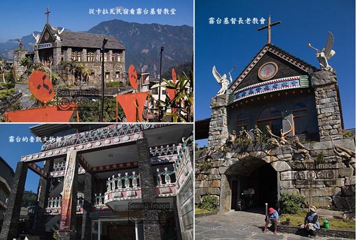 霧台基督教堂:霧台的基督信仰自1950年才開始,於1958年由信徒捐地在現址蓋了第一間教堂,歷經三次改建。現在看到的這間完工於2007年,歷時5年多,設計興建者為杜巴男及其兒子杜再福(卡拉瓦),此教堂也是杜巴男的遺作。教堂牆面由石頭堆砌而成,宛如一間小城堡,上面佇立兩座吹送福音的天使像,以及一位敲鐘的貴族像;走上二樓的樓梯扶手,是族人們正通力合作興建教堂的塑像。整座建築充分利用塑像以及魯凱族元素,精采的程度讓我想到巴塞隆納的聖家堂。