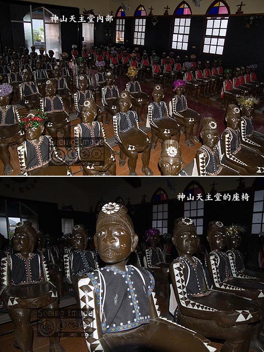 神山天主堂:又稱「耶穌聖心堂」,於1959年設立,教堂內部的牆面以大塊石板鋪設而成,外面座落一旁的活動中心也以碎石板裝飾,整座教堂是族人通力合作所完成。這裡也是到處充滿魯凱族圖騰與塑像,就連耶穌也是魯凱族裝扮,幽默得令人莞爾;尤其教堂內的座椅,讓人看了不禁哈哈大笑,每一個都是一尊原住民塑像,他們一個個側著臉坐在一排椅子上,信徒們則坐在他們的大腿上,每尊塑像都背著一個小背包,裡頭放的是聖經,整體看過去,簡直可愛到不行!問題是,為什麼每個人的臉都是朝右看呢?杜谷媽媽告訴我:因為當時為了省錢而只買一個模子,所以就一律向右看齊囉!