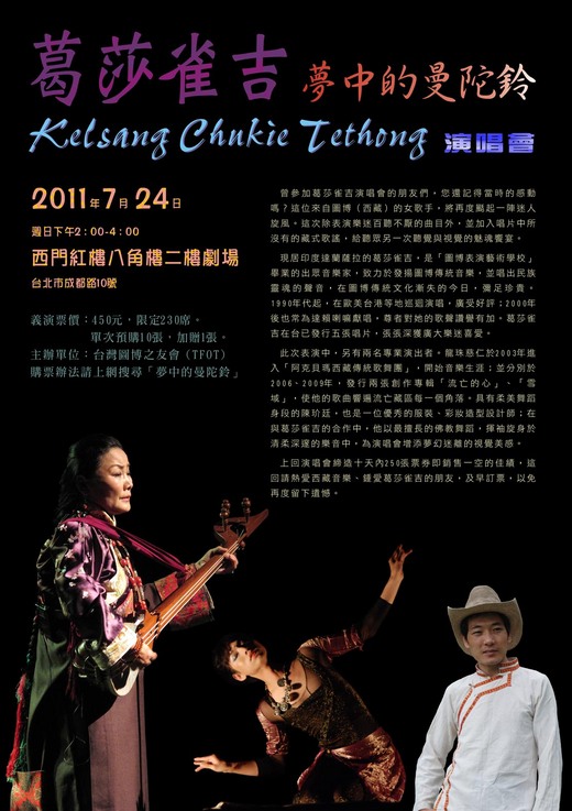 上回演唱會締造十天內250張票券即銷售一空的佳績,這回請熱愛西藏音樂、鍾愛葛莎雀吉的朋友,及早訂票,以免再度留下遺憾。