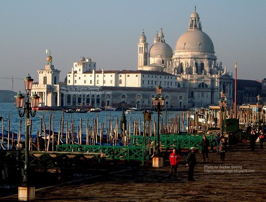 買個義大利三明治Panini到聖馬可廣場當早餐,此時遊客還不多,除了多個嘉年華舞臺,和我兩個月前來沒什麼變化:空氣依然清新,透著一股運河的腥味;對岸的教堂也還在水氣中迷迷濛濛,陽光怎麼照也化不開似地;而整修中的樓面也依然蓋著畫布,一如嘉年華面具般,對沒看過的人來說,神秘面罩下的真相總是教人好奇。