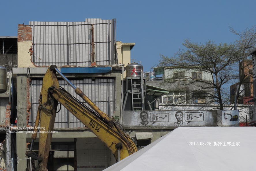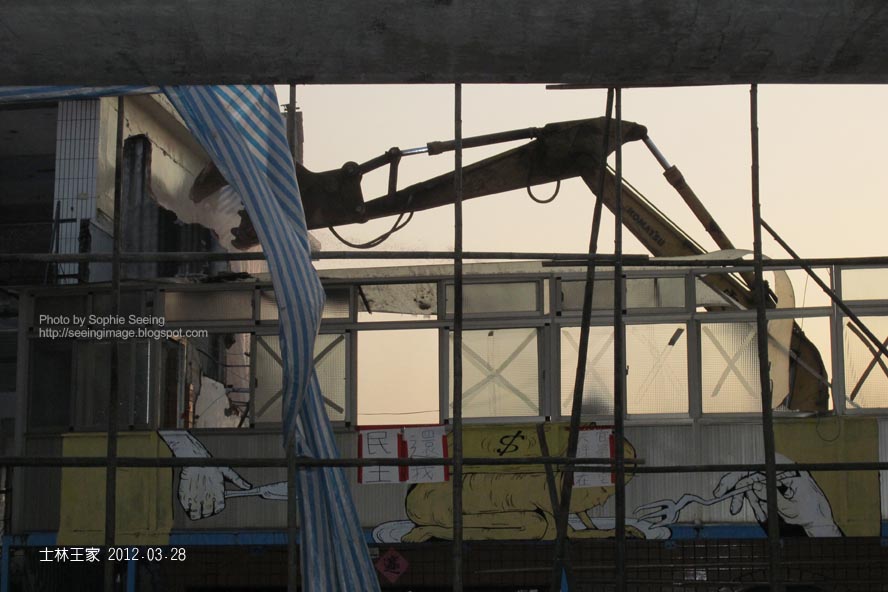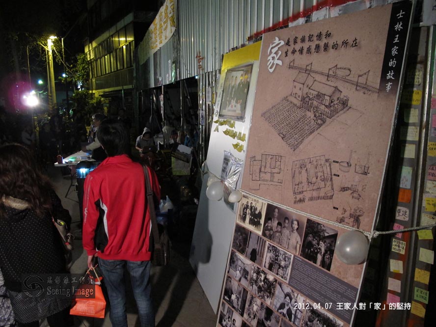 從一開始知道「士林王家」都更案爭議,隨即加入網路連署,到聽說王家接獲市府公文的拆遷通知,終於第一次繞了好大一圈找到王家(我一直以為是捷運站另外一頭,士林紙廠附近,因為那裏也有很多老舊房子),那天不過才3月18日晚上。將近深夜,一群學生、關心人士還聚集在王家客廳商議接下來要如何奮戰,我也跟幾個人站在外面聊了好一陣子,此時淡淡的哀愁瀰漫在王家裡裡外外,捷運轟隆聲不時伴隨而過。