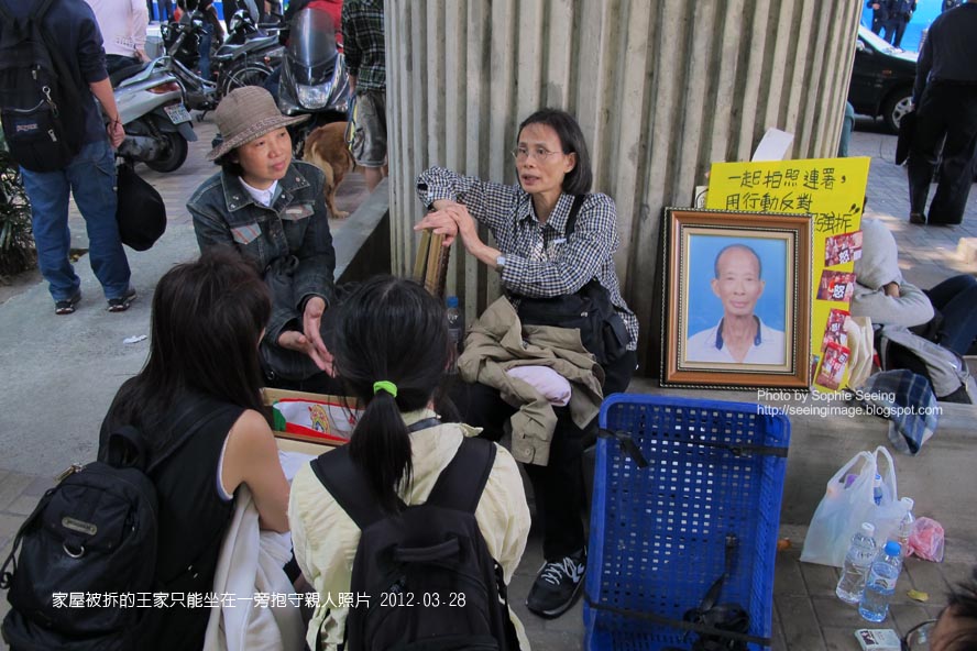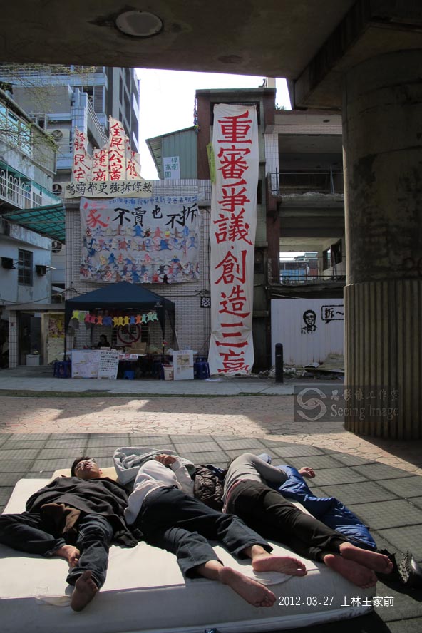 3月27日下午,一個極好的天氣,儘管我不認識王家任何一個人,還是決定再度抽空到王家看看,表達我的關心。這時門口已經有幾位年輕人擺了一個攤子,適時跟前來關心的民眾解說情況;而捷運橋下有張彈簧床,上面躺了三個年輕人,這幾晚聽說他們輪流守夜,就怕警政人員的突襲,此時已是風聲鶴唳的狀況。