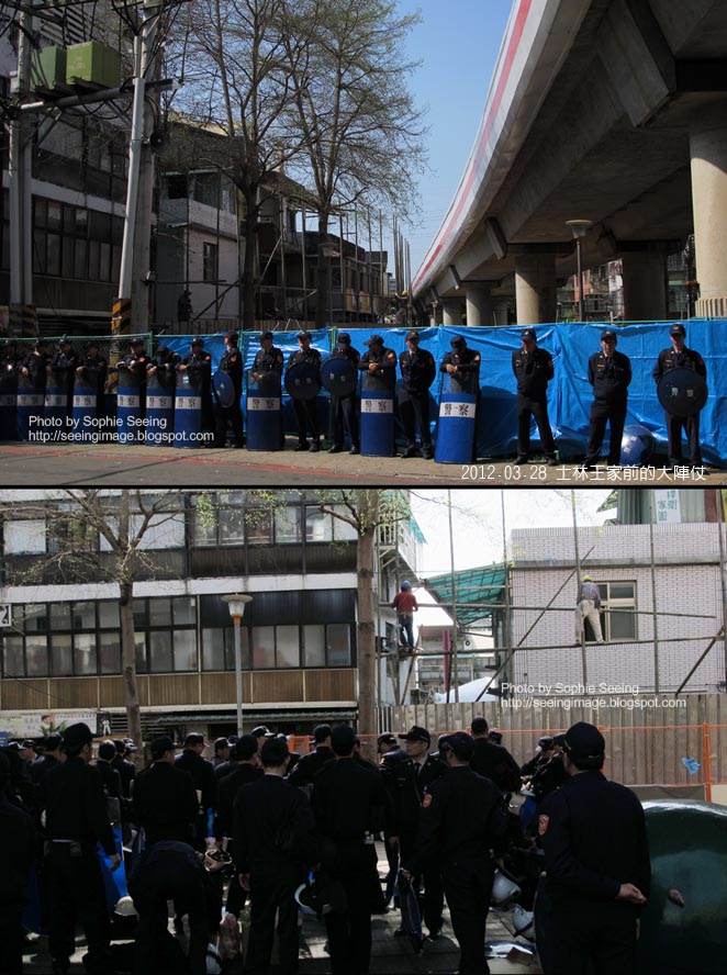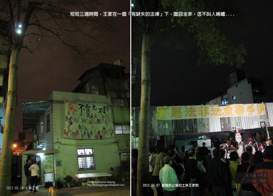 中午又上網,得知一切已經發生。早上七點,千名警力硬闖王家,把抵抗的學生、教授、群眾,一個個強拉、硬抬、丟上公車,分別載往青年公園和木柵才放人;而王家人,手持祖先照片、牌位,一個個淚留滿面被驅離自己的家,他們不知自己到底犯了什麼大錯,要被政府這樣的對待,殺人?放火?搶劫?偷竊?詐騙?誘拐?還是逃漏稅?沒有,他們只是有一塊祖先的地在士林,世居此地百多年,而這塊地被建商看上了,所以他們只能被迫讓出。對於所謂的「都市更新」,擁有合法產權的王家人,竟毫無說「不」的權利!