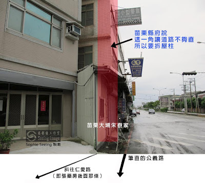 跨過仁愛路往前走,是朱樹老先生的家,他的牽手朱馮敏阿嬤,為了抗議家產被徵收,2010年8月3日服農藥自盡,雖然後來他家的多處田產、房產被保留下來,但是政府仍不願放過一個屋角。政府認為朱家其中一棟房子的柱子突出,以致於礙到馬路的「筆直性」,而且其他幾百戶都拆了,朱家也應平等對待,但是政府會用工程技術來補強樓房,不致發生危險。朱家則希望將樓房旁邊的鐵皮屋拆除就好,甚至願意自拆而不需任何補償,不要為了一個無謂的道路筆直而讓他家面臨倒塌的危險。