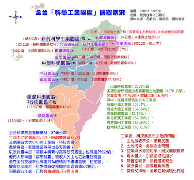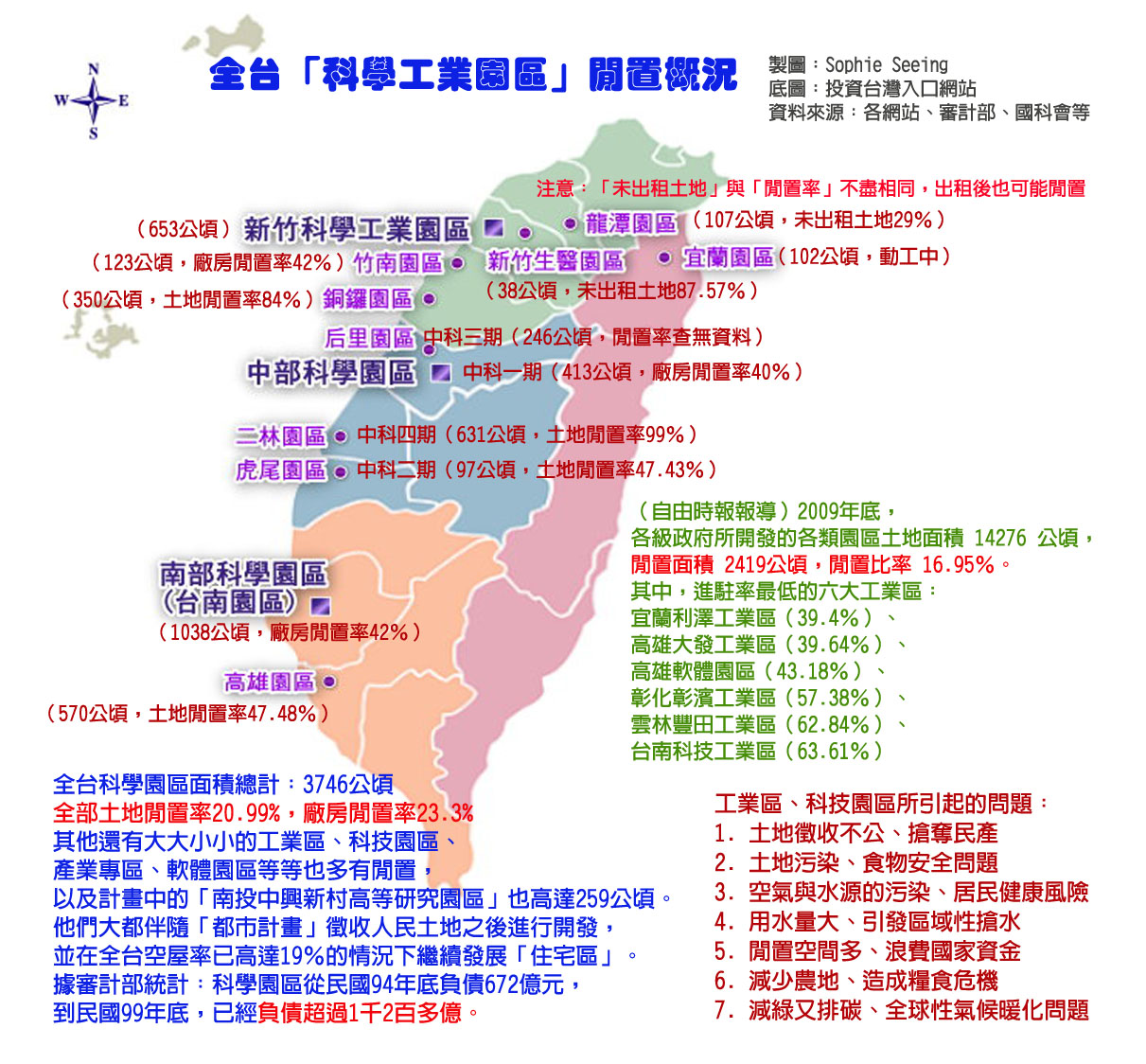 1. 全台科學園區面積總計:3746公頃,土地閒置率20.99%,廠房閒置率23.3%。