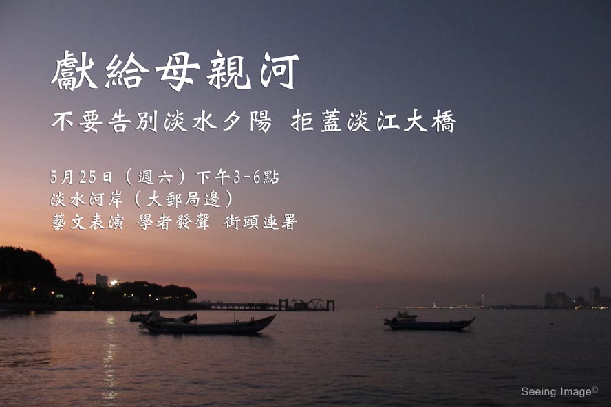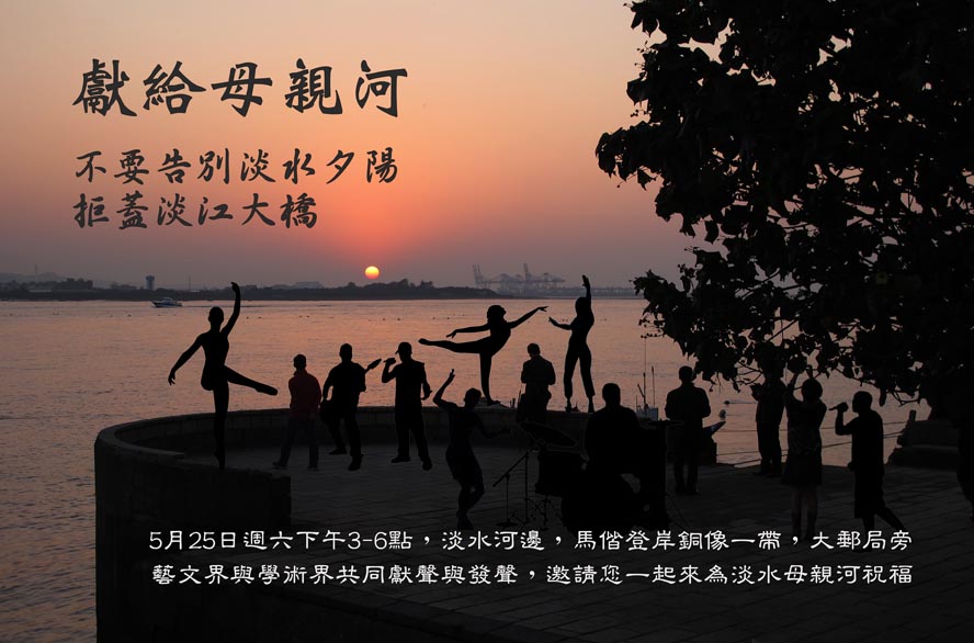 我們除在網路正進行連署之外,也將在5月25日週六下午3-6點於淡水河岸,藝文界將用最深情的演出,獻給北台灣的母親河--淡水河,感謝並祝福她,一如當年馬偕博士對台灣的疼惜與摯愛。