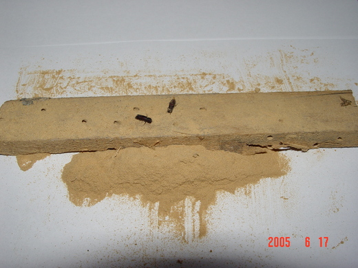 圖:木蠹蟲蛀蝕孔(被粉末蓋住)與排遺的粉末