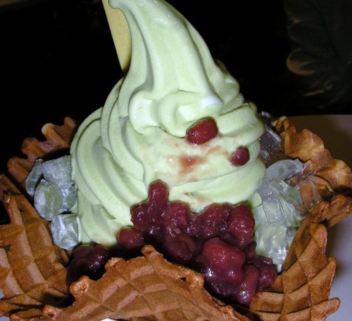 東京綺夢是抹茶霜淇淋,還有小顆的蜜紅豆,透明的蒟蒻塊(還是葛粉之類的),還有一顆顆綠綠的,不管是什麼,反正都能吃啊~