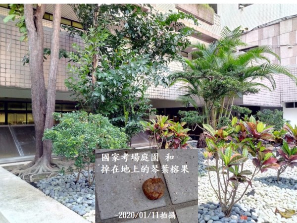 從2018年底的市長、市議員、公投等選舉開始,我們社區的投票所從永建國小改為在國家考場一樓;陽光普照的2020/01/11,投完總統、政黨、區域立委選票之後,在國家考場小庭園走了一圈,發覺有一棵高大的琴葉榕,從地下一樓中庭挺立而上,榕果掉到地面石頭陣中;一棵葉子茂密的叢立孔雀椰子,伴著幾株變葉木,以及設來讓考生們休息的座椅,可說頗為貼心。