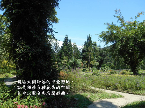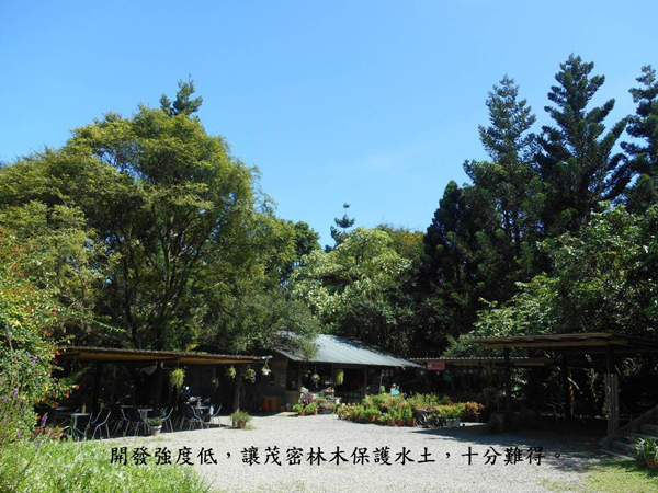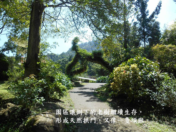 黃先生說,他們依著原先梯田的平臺階段作土地使用,從來沒有發生過土石流的情形。我們看見園區讓倒下的老樹繼續生存,形成天然拱門,型狀又像一隻頑皮的猴子。種植各種吸引遊客來賞花朵的空間,就是階地平臺,有大樹錯落期間。這樣低強度的開發,並且種值林木來保護水土,應該是沒有發生土石流的最大功臣,這樣的經營理念十分難得。