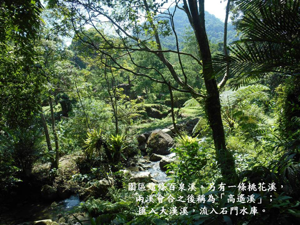 當天我一直聽到水聲相伴,原來它叫作百泉溪,原區另有一條桃花溪,兩溪會合之後稱為「高遙溪」;高遙溪匯入大漢溪之後流入石門水庫,再慢慢匯入淡水河。幾年前的【石門水庫及其集水區特別治理】政策之中,高遙溪也占有一席之地,我們來的前一天正逢大雨,打雷還把園區造成停電,但是我們所看見的百泉溪水非常清澈,流暢的水聲,令人心曠神怡。