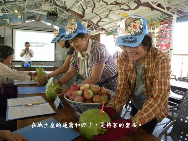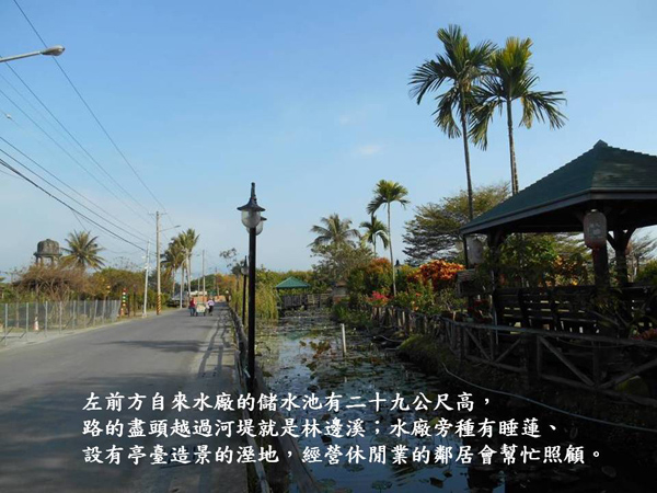 社區裏有一處自來水廠,是民國二十五年建立的,當年民間並沒有自來水可用,這是提供大鵬灣的空軍基地的水源;大鵬灣地處林邊鄕和東港鎮的交界處,它是由於林邊溪和東港溪長期夾帶泥沙,先經過洋流季風的漂送,形成南平半島,再逐漸圍堵而成腹地廣闊的大灣澳,也是全台最大、最完整的囊狀潟湖。(註一)漁民稱呼潟湖叫『內海仔』,他們都知道這是生命力最旺盛的地方。想當初日本政府一定也很重視這塊瑰寶,所以早早就要建設自來水的供應設備。如今,水廠每天供應林邊鄕約七千噸的水量,其中,原水主要由牡丹水庫供應,林邊溪水和地下水次之。由於園區週邊空地很大,自來水廠沒有足夠的人力來整理,很容易雜草叢生,孳生蚊蠅,加以噴灑藥物的話,擔心會影響水質和環境安全,於是永樂社區就認養水廠園區,把周邊整理得美侖美奐!