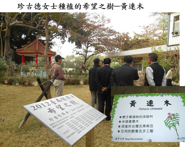 學校在2012年,邀請了聞名全球的保育典範珍古德女士來學校種樹;校方分享說,珍古德女士種樹時不用任何工具,僅僅用雙手掘土、捧土覆蓋苗木,呵護土地與生命之情,溢於言表。他們請珍古德女士種植的是黃連木,據報導中義工們的說明,緣起於黃連木古稱「楷木」,《說文‧木部》上載「「楷,楷木也,孔子冢蓋樹之者。」是孔廟常見的庭園樹種。《淮南草木譜》則記載:「模木,生周公塚上,其葉春青、夏赤、秋白、冬黑。」楷木的剛直挺拔,模木的色彩多變與純正名貴,兩種樹木的稀少,以及生長在聖人墓上的特點,後人就以「楷模」來形容品德高尚、高風亮節,足以作為表率的人士。