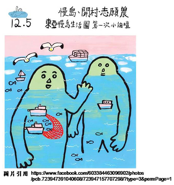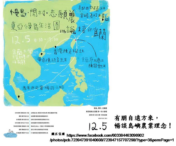 最新出版的第71期《青芽兒》中,有一篇宜蘭大學陳永松老師寫的文章〈小農是否能共創新農業及新農村?─東亞慢島生活圈/第一次小論壇側記〉,這個論壇是2015年12月5日在宜蘭大學舉行的,主辦單位是宜蘭農業處,論壇中安排來自日本九州島、香港島、海南島、馬來西亞檳榔嶼、台灣島等島嶼的講者,每位分享一個小時的個人經驗。陳老師是研究海洋範疇的學者,他在文中有一段很動人的描述:「以學海洋的觀點來看,地球上的海洋是連成一片的,而陸地是相互分離的,大體上是海洋包圍了所有陸地。其實在國界並不特別明顯的時代裏,九州/香港/海南島/檳榔嶼,不也可將之視為與台灣隔海相望的鄰村嗎?」這段文字和活動海報所呈現出來的,真有“天涯若比鄰”的感覺。(陳永松老師另有一項研究,請閱:《農民曆中蘊藏的密碼》http://blog.udn.com/selin7777/3811825)