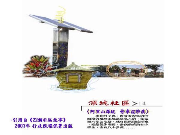 我們節目曾經在2009年11月21日播出過《山坡間的小水塘~嘉義中埔深坑社區》 (請閱:http://blog.udn.com/selin7777/7910300 2009.11.21)。當年製作節目的背景因素有兩個,一是2007年受行政院環保署委託出版的《22個社區故事~》書中,我們曾經以〈阿里山深坑 停車浣紗溪〉為題材書寫阿里山腳下深坑村的故事;二是2009年參與東南科技大學徐貴新老師在台灣大學的研究專案【生態工法暨生物多樣性人才培育計畫】,要為中小學師生編寫山坡地保育方面的參考教材時,就選擇以這個山坡間的小水塘為案例。兩度書寫之前,我們都前往拜會深坑社區的鄉親,特別是提供土地回復埤塘樣貌的曹榮旭先生。